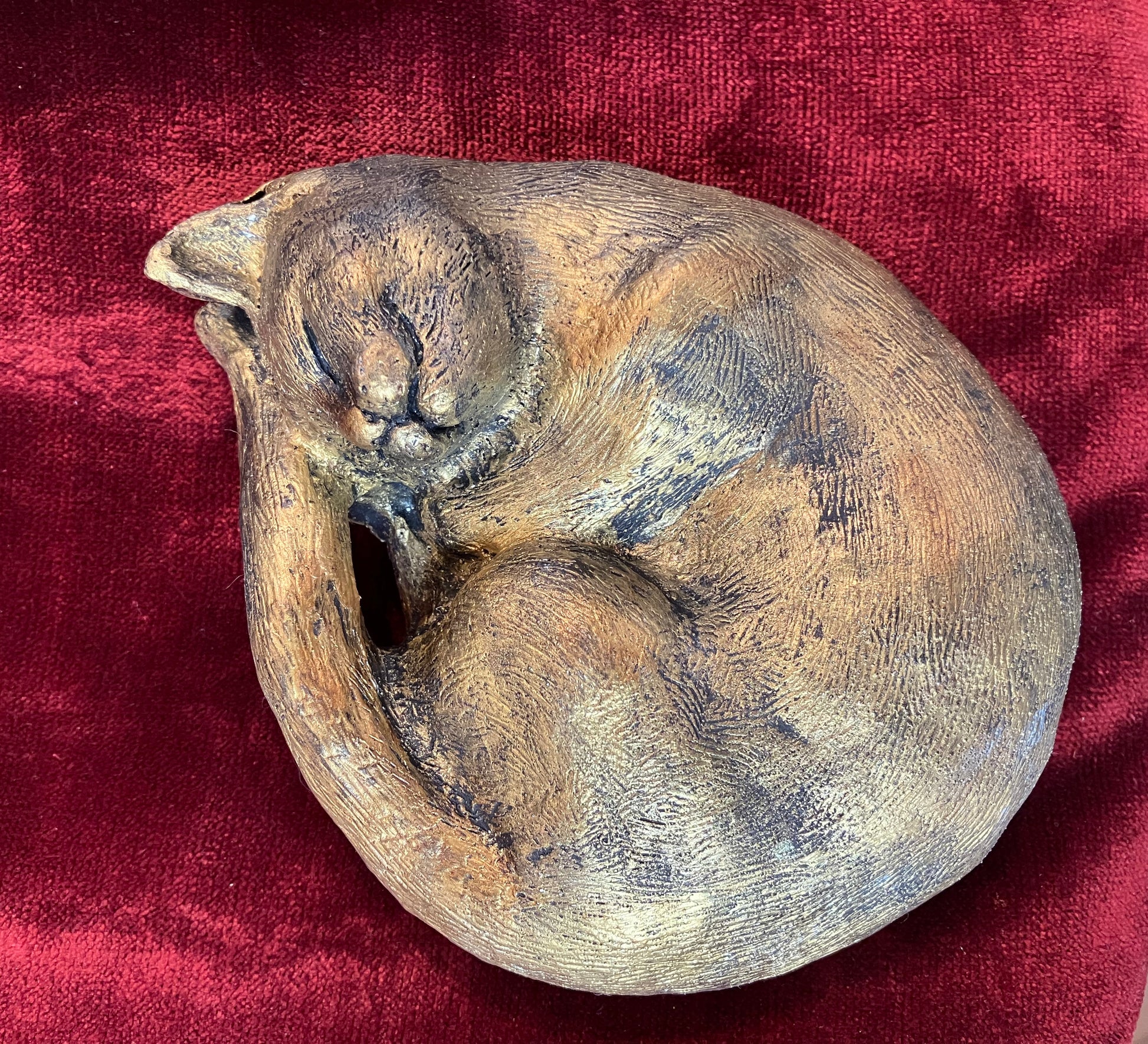 Original sculpture of a sleeping cat, curled into a rounded form. Ella is 5 inches round, cast in hard plaster, and hand painted by the artist. Limited edition, signed and numbered.